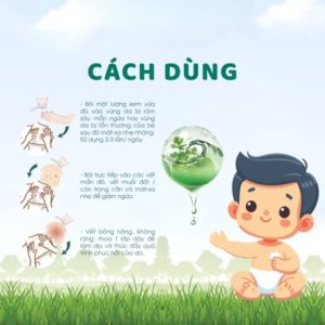 Bôi một lượng kem vừa đủ vào vùng da khô, mẩn đỏ, rôm sảy hoặc toàn thân — sau tắm hoặc khi bé da khô. Massage nhẹ nhàng để kem thẩm thấu.