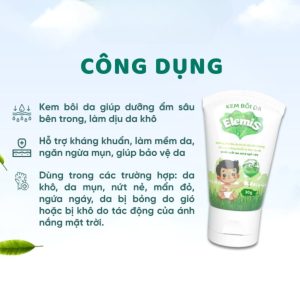 Một trong những sản phẩm đáng cân nhắc hiện nay là Elemis – Kem bôi da 30gr, được thiết kế riêng cho da bé từ 0 tháng tuổi trở lên. Theo thông tin từ nhà bán hàng: kem bôi da Elemis giúp dưỡng ẩm sâu, làm dịu da, ngừa kích ứng và bảo vệ da khỏi các tác nhân bên ngoài.