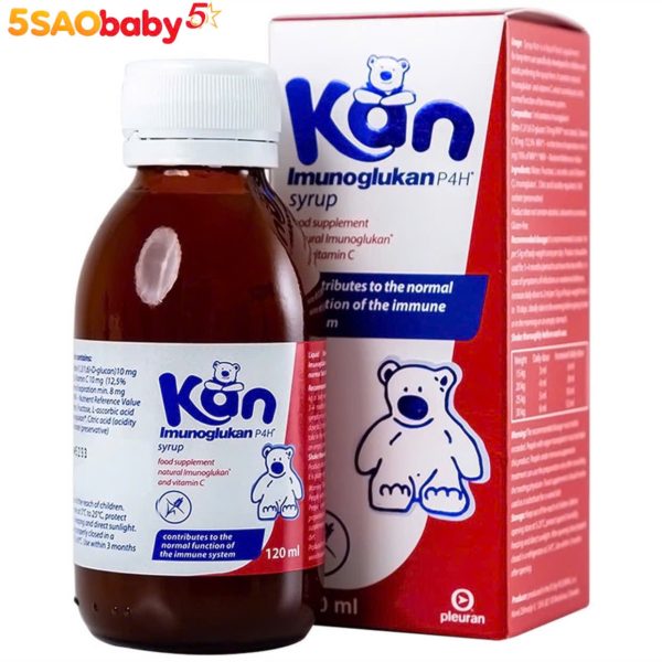 - Siro Gấu Kan Imunoglukan P4H bổ sung Beta-glucan-(1,3/1,6)-D-Glucan có tác dụng kích thích hệ miễn dịch, giúp tăng cường thể lực, hỗ trợ miễn dịch, nâng cao sức đề kháng ở trẻ em.