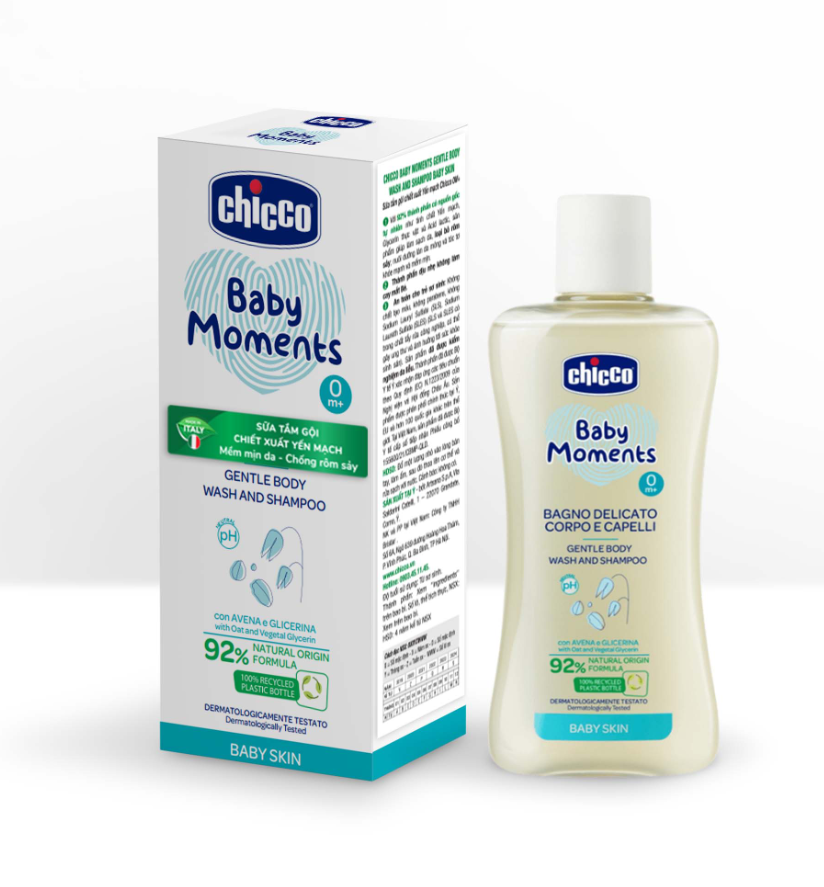 Sữa tắm gội Chicco 0M+ chứa 92% thành phần có nguồn gốc tự nhiên, nổi bật với chiết xuất yến mạch và Glycerin thực vật. Yến mạch cung cấp vitamin B và axit amin, giúp làm mềm tóc và giữ ẩm cho da. Glycerin thực vật hỗ trợ cân bằng độ pH, dưỡng ẩm và làm mềm da bé.